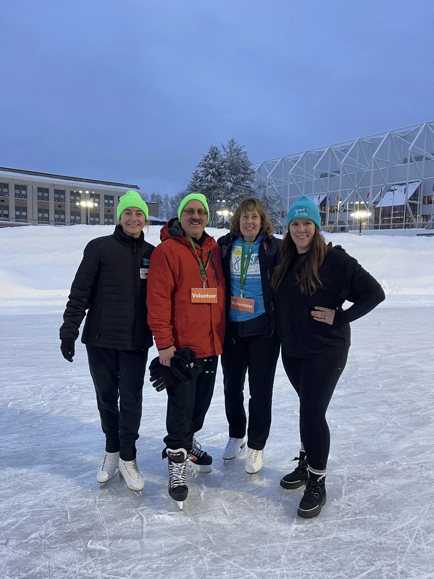 Andy (in orange) with his wife, daughter, and CARES National Outreach Manager Kim Volante (right) at Sk8 to Elimin8 Cancer® Lake Placid in 2026
