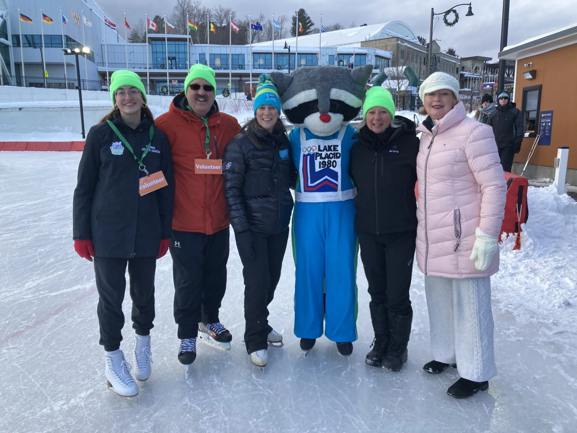 Andy (in orange) with his daughter (far left) CARES Coordinator Lauren Anderson (striped hat), Roni the Raccoon, and invited guests from Adirondack Health at Sk8 to Elimin8 Cancer® Lake Placid in 2025